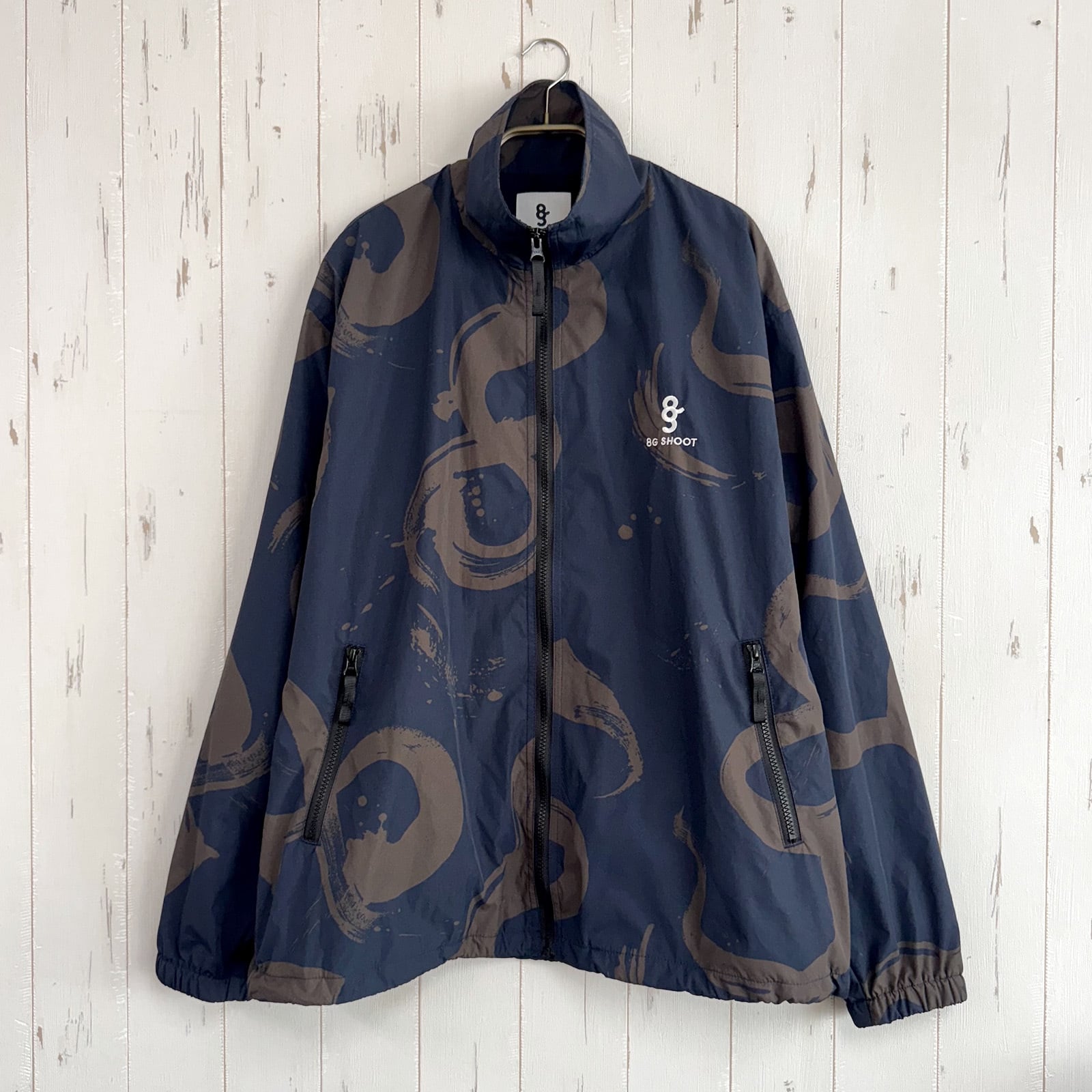 「書道家の青柳美扇さんによる、8G SHOOTのロゴを総柄に落とし込んだ、和とファッション性が程よいバランスのナイロントラックジャケット。