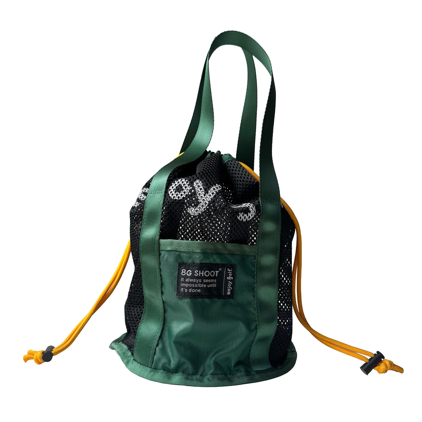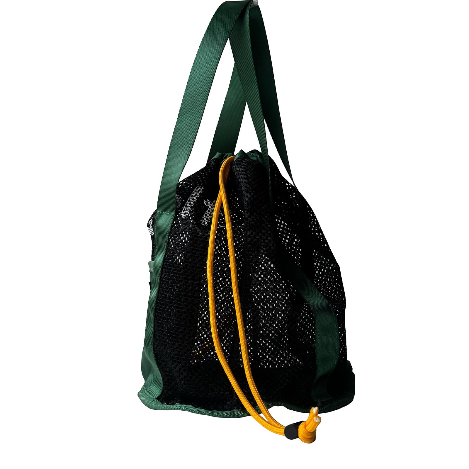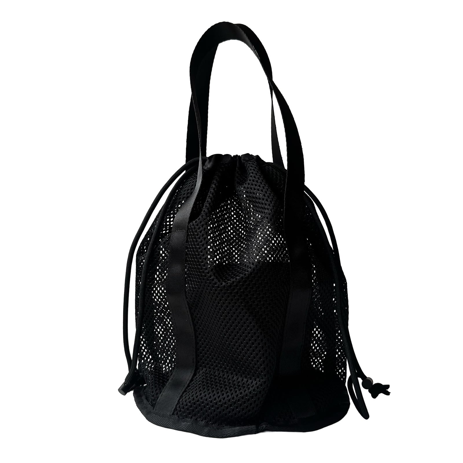「軽量でコンパクトに畳めて持ち運び便利なメッシュ巾着バッグ。外側にポケットあり。」