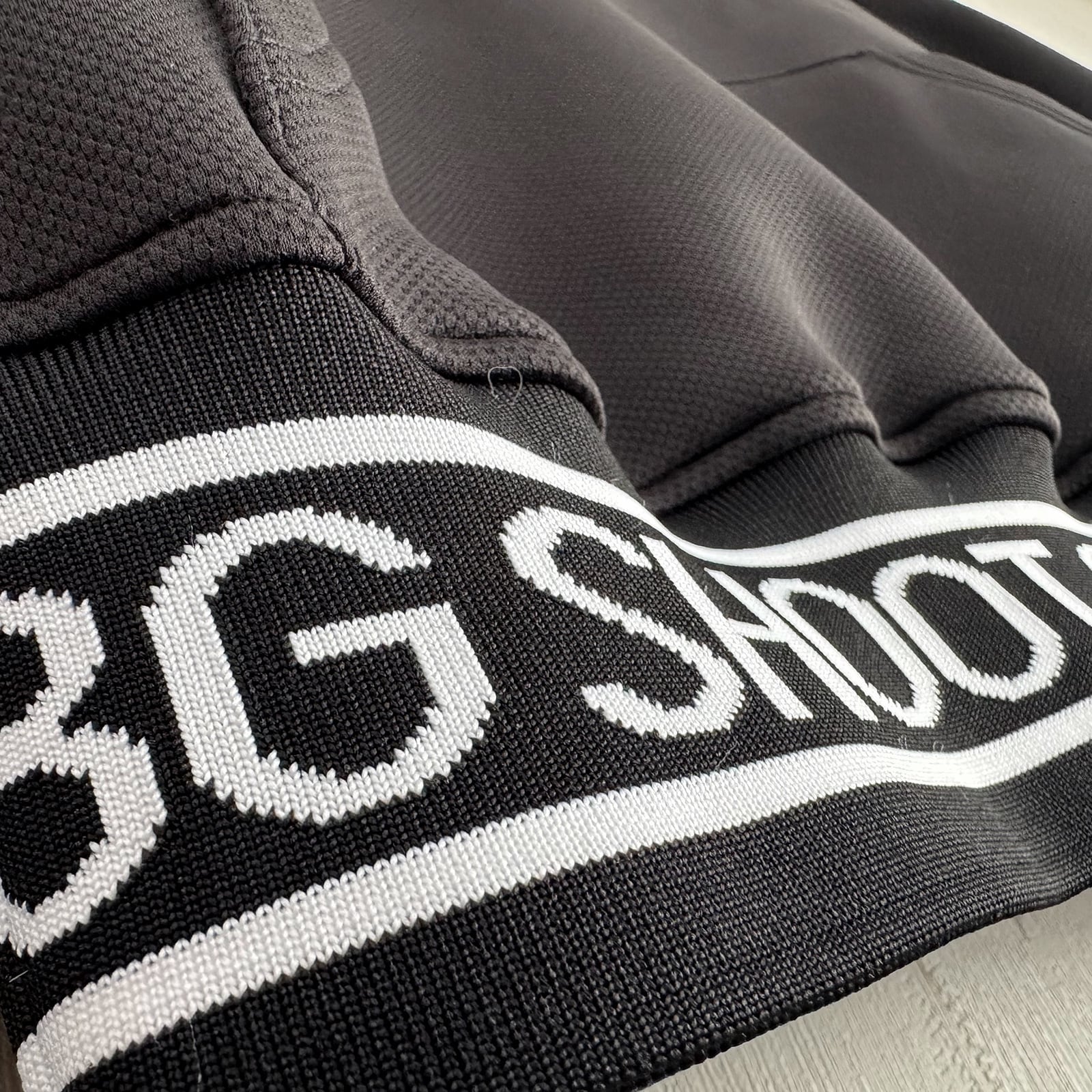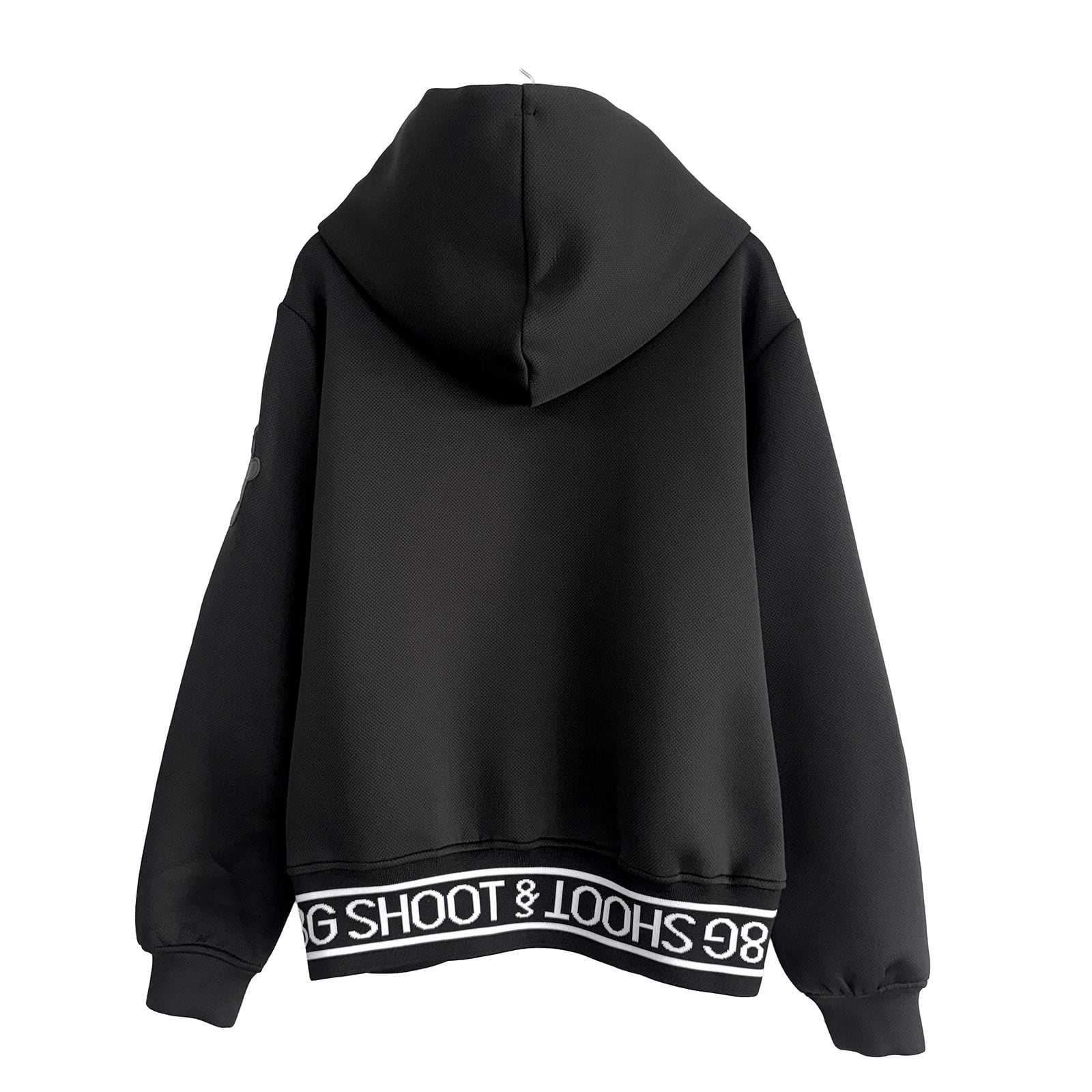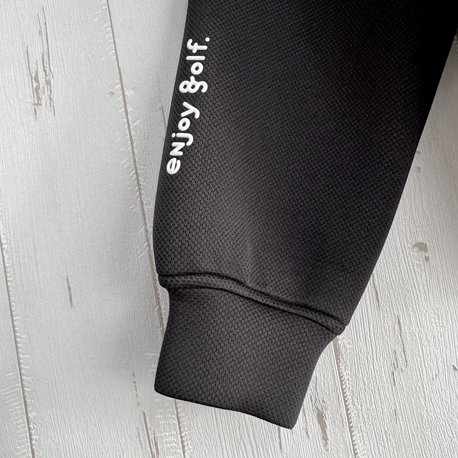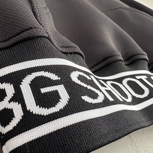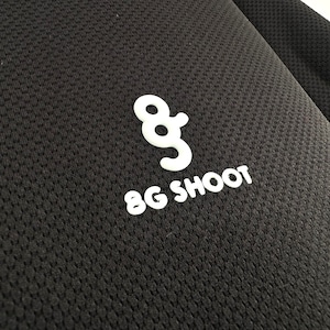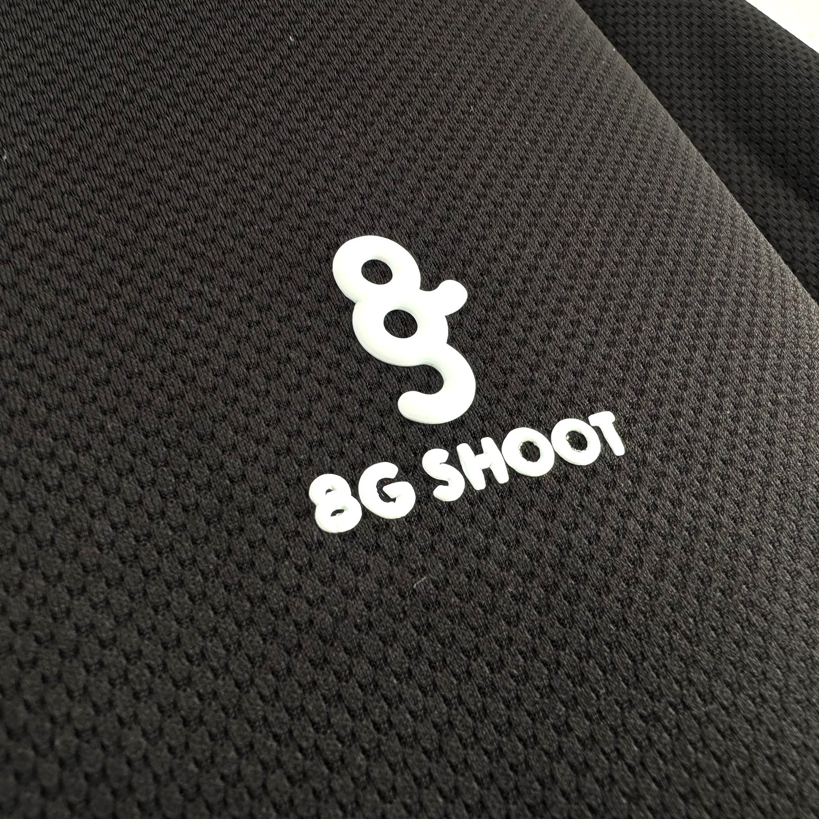 裾に8G SHOOTロゴを表現したジャガードリブ、左袖に便利なロゴ型のティー刺しを配しました。