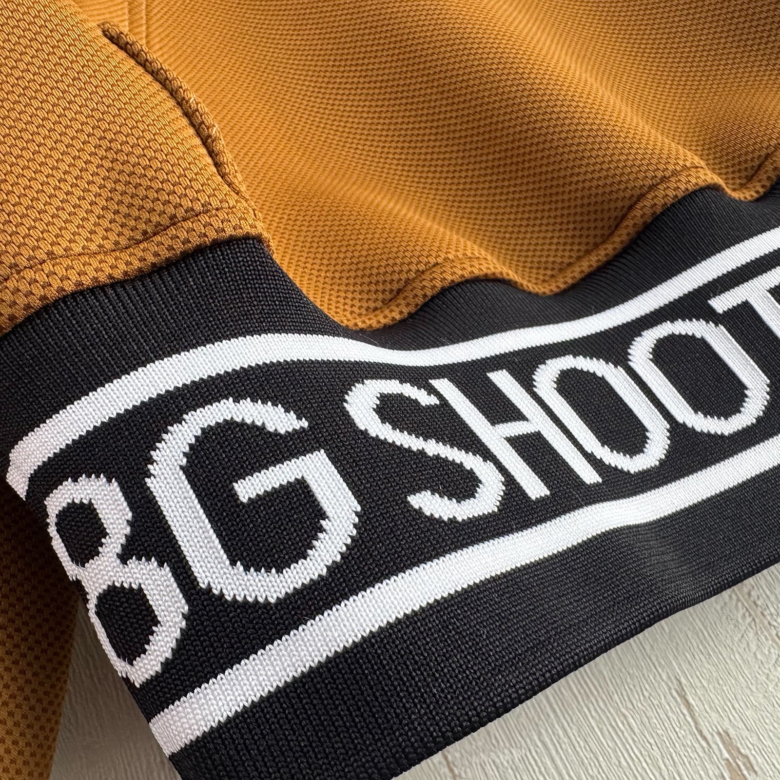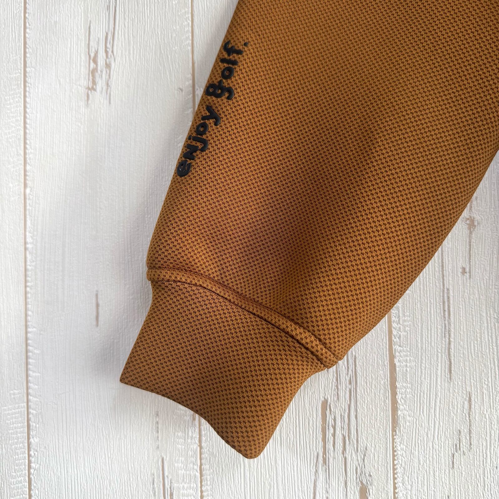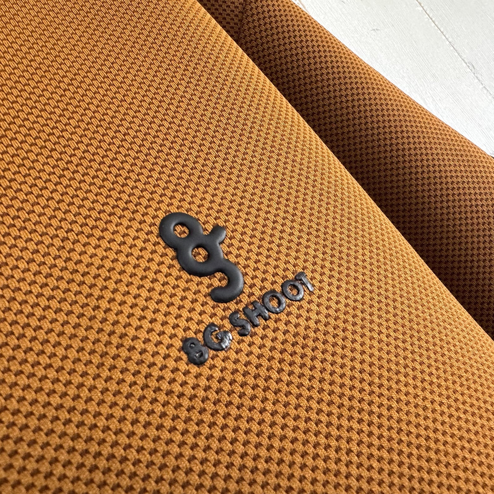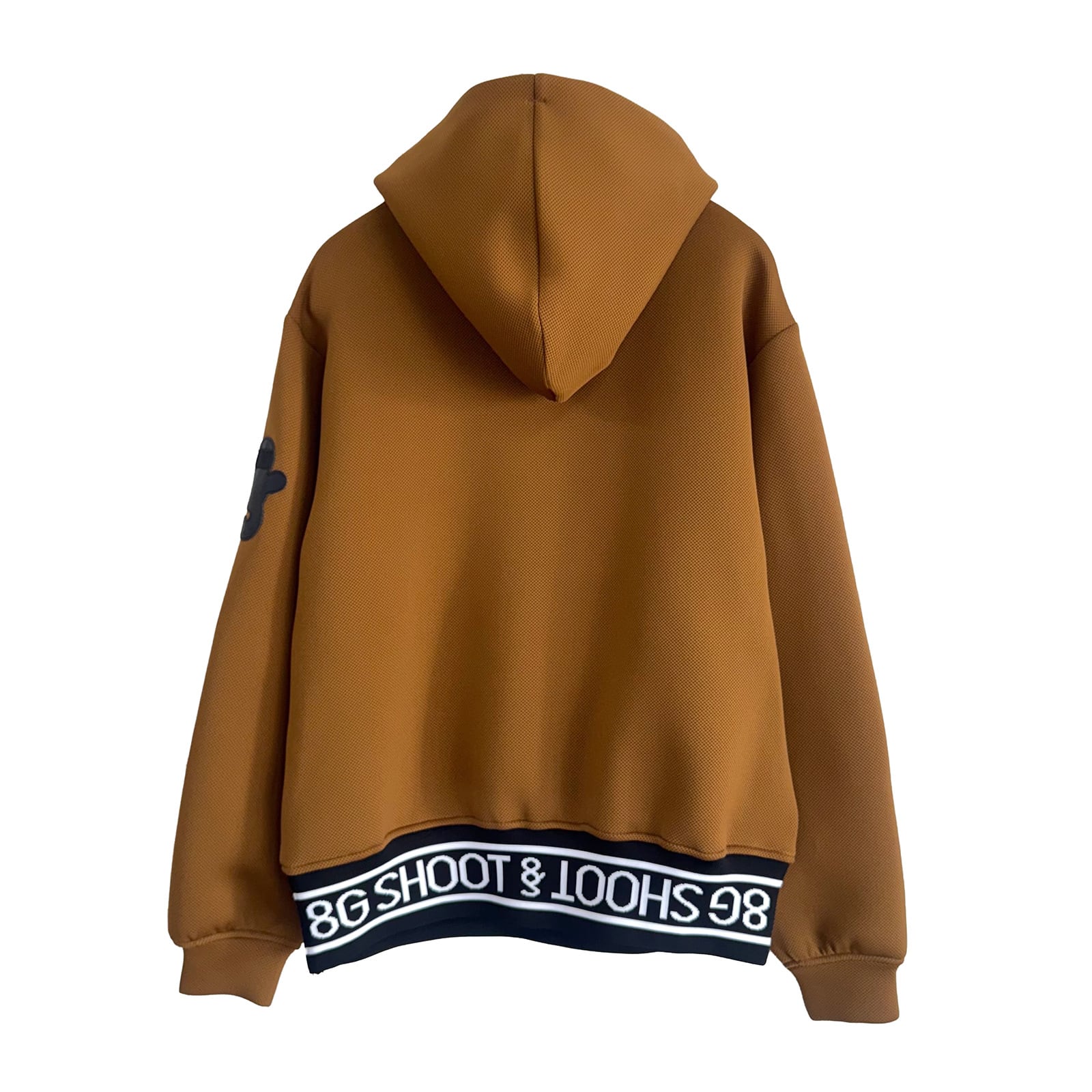 裾に8G SHOOTロゴを表現したジャガードリブ、左袖に便利なロゴ型のティー刺しを配しました。