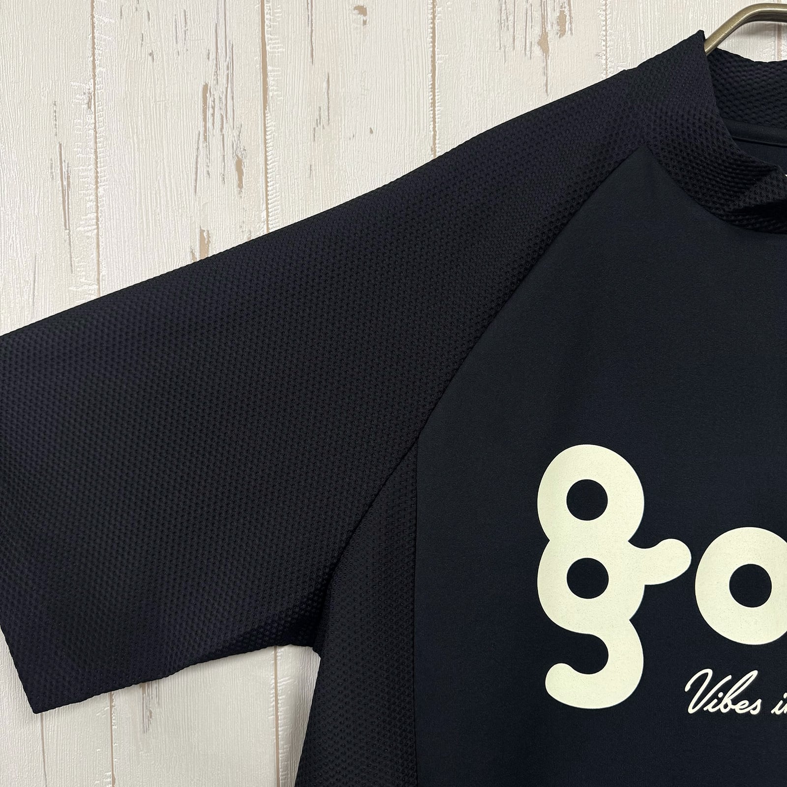 8G SHOOTの定番の「回収されたペットボトルから再生された、『リサイクルポリエステル糸』で編み立てた素材と抜群の通気性にストレッチ性、吸水速乾機能を持ち合わせたメッシュ素材を切り替えたモックネック。