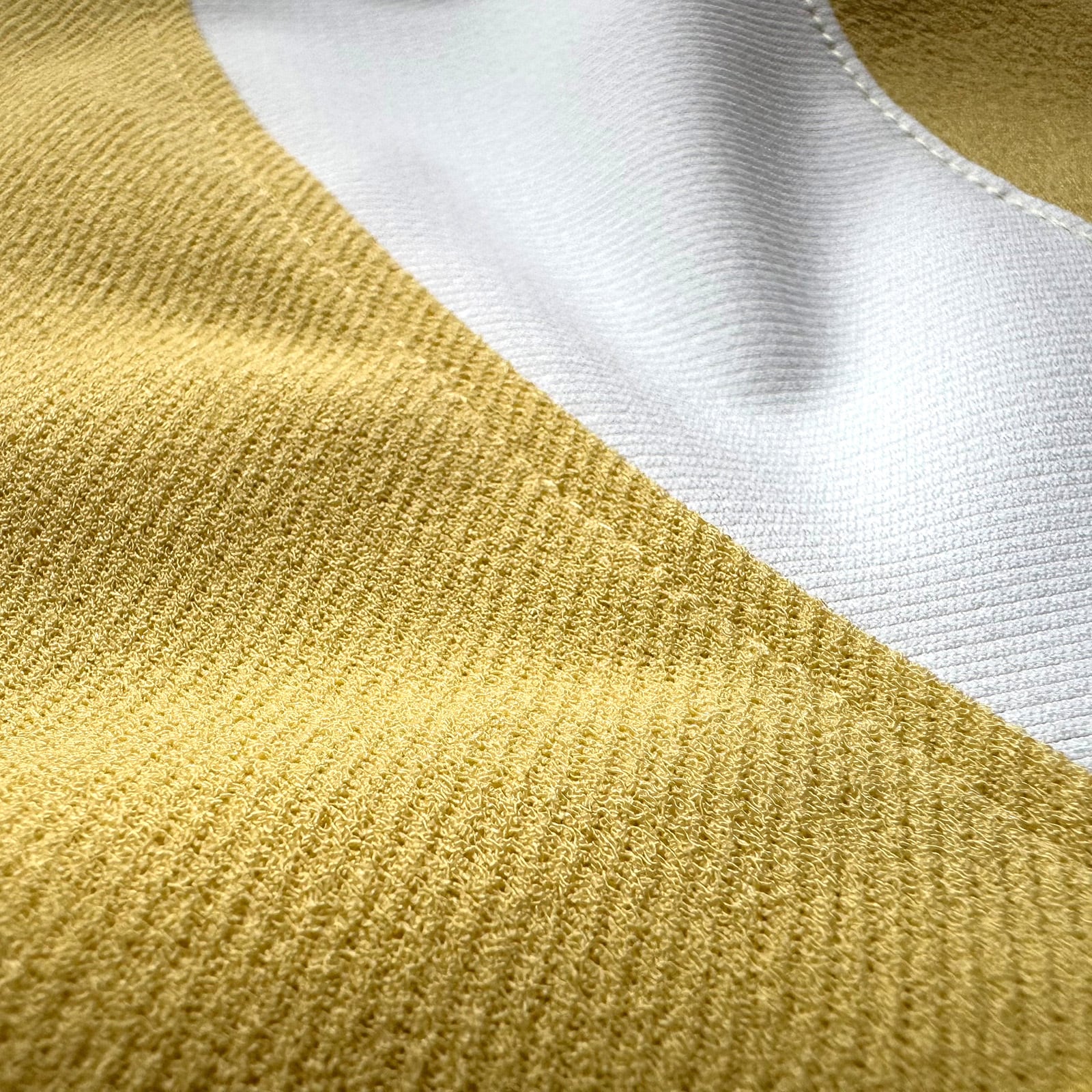 「ジョーゼット調とツイル調の表面感をかけ合わせた、軽量で膨らみのある素材を使用したモックネックタイプのフットボールシャツ。