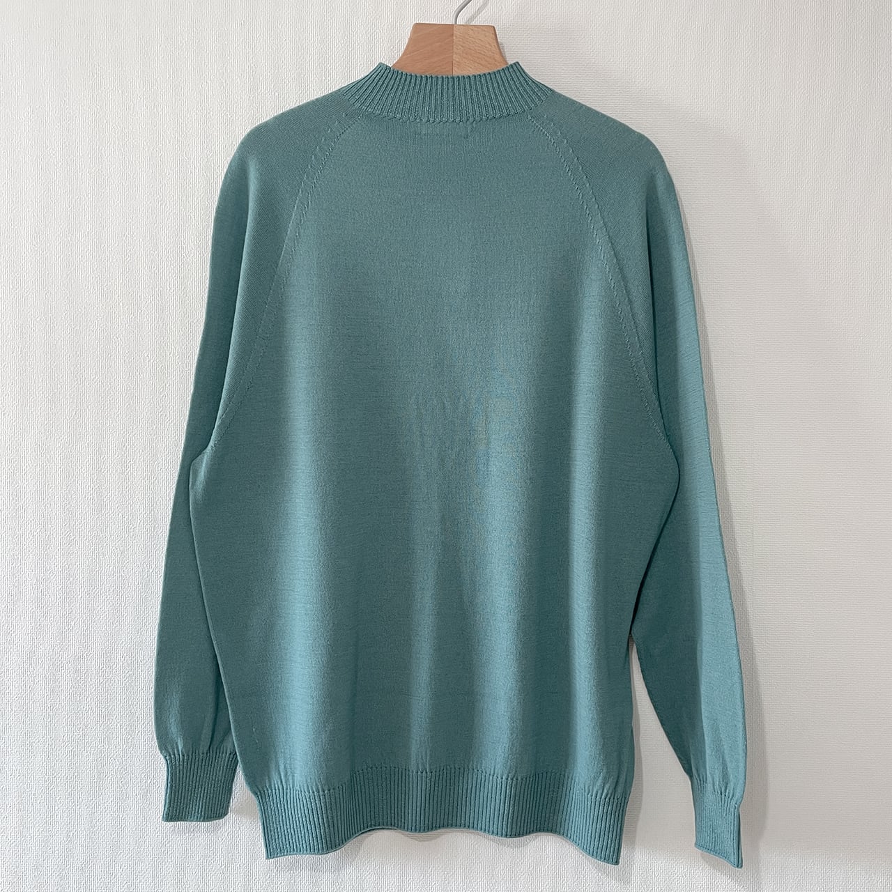 袖はラグランスリーブ仕様、ホールガーメントで編み立てることにより、ピリングに強く、動きやすさと着心地を兼ね備えた仕上がりになってます。」